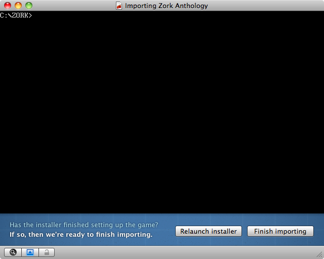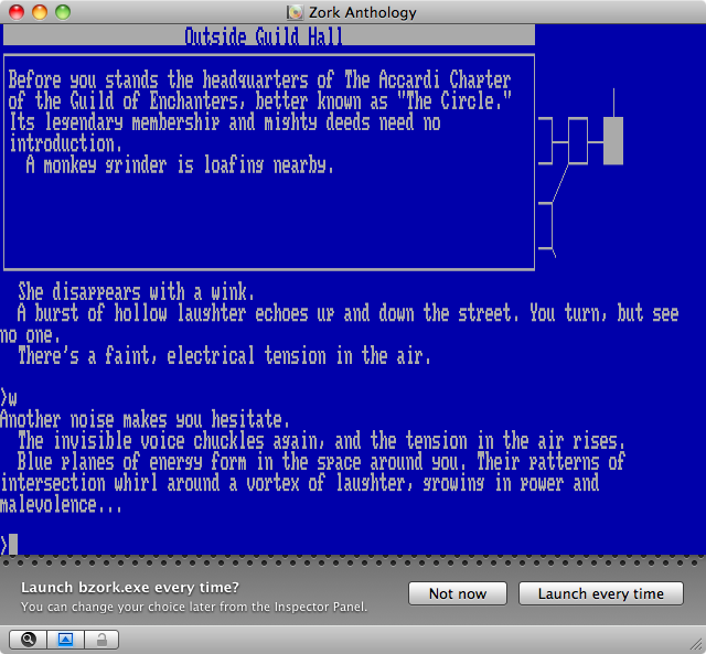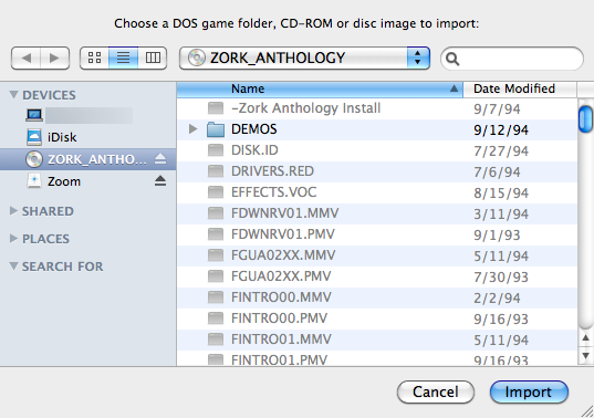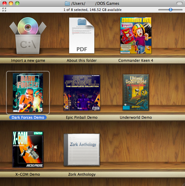 Fresh from the “I’m pretty sure I’m the only one who’ll find this information useful” department, I’ve decided to post a brief “How-To” on how to play classic DOS games you might have purchased back in your PC days on your current Mac OS X system. Why would you want to do this? Well, in my case, it all started when I was helping my brother clean out his basement a couple weeks ago, and the light bulb blew out. I immediately made the hilarious comment “We are likely to be eaten by a Grue”, knowing he was one of the few other people I knew on the planet who would get the classic Zork reference, and I couldn’t let the opportunity pass by.