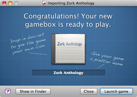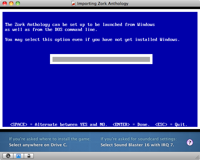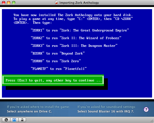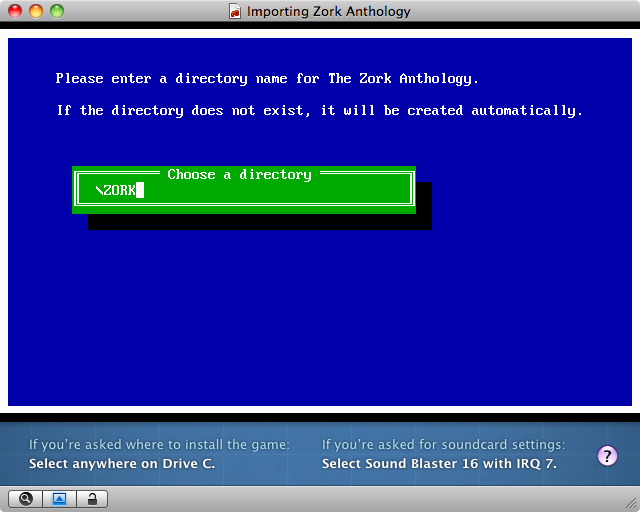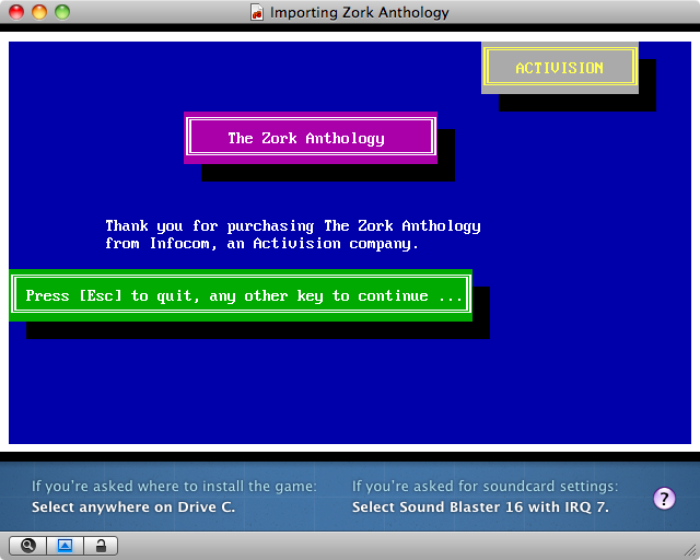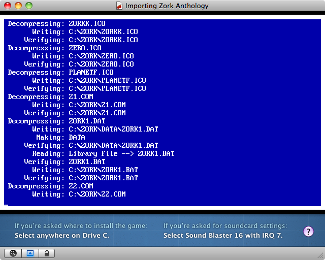 As I mentioned, I happen to still have had my original Zork Anthology Disc, which despite being Mac and PC compatible, predated Mac OS X by about 5-10 years and had long since become useless. However, BOXER can read these discs, and install from the old PC .EXE installers, so the Mac compatibility part of the disc doesn’t really even factor into it. BOXER is powered by DOSBox’s robust DOS emulation, which means it’ll play almost any DOS game you throw at it.