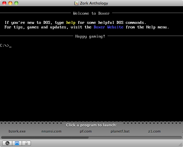First, in order to play an old DOS game on BOXER , you’ll need an old DOS game. There are actually quite a few free ones available, or I’m, sure you could Google them and find a ton, legal or otherwise (here are some, here’s some more, and here’s another nice repository). I think the first 3 Zorks are actually out of copyright and can probably be found everywhere online.