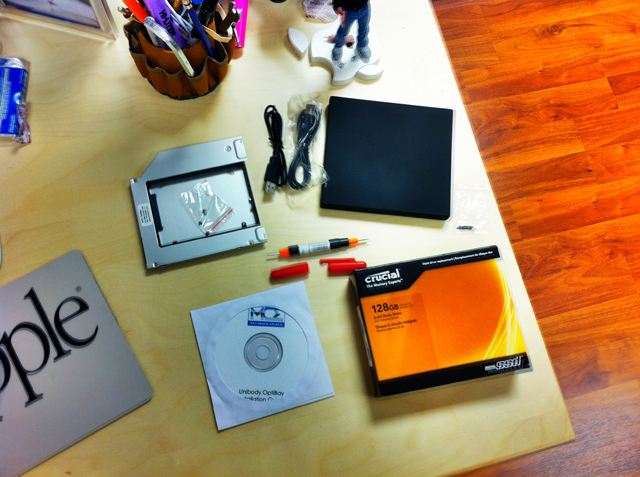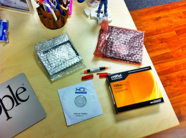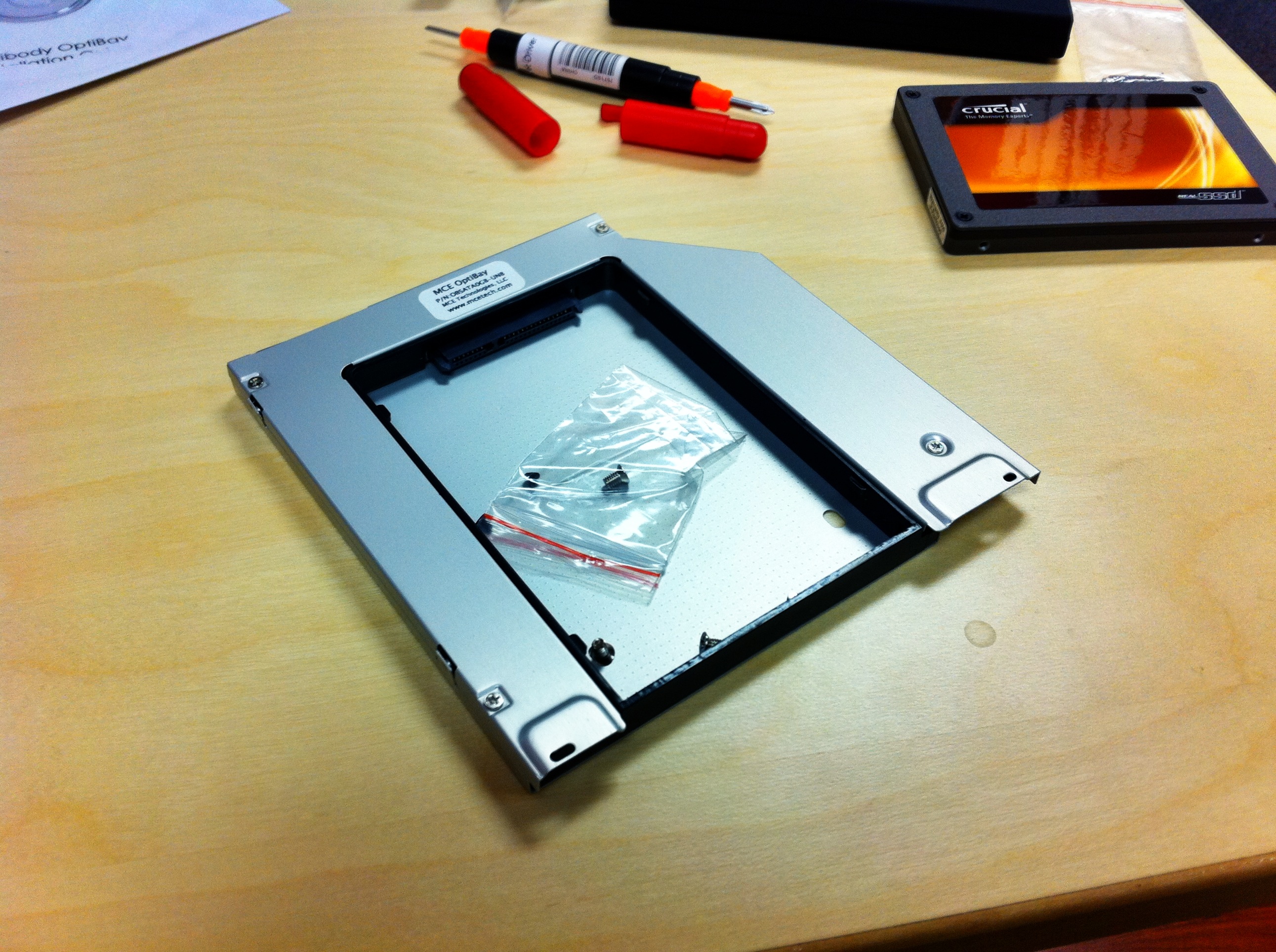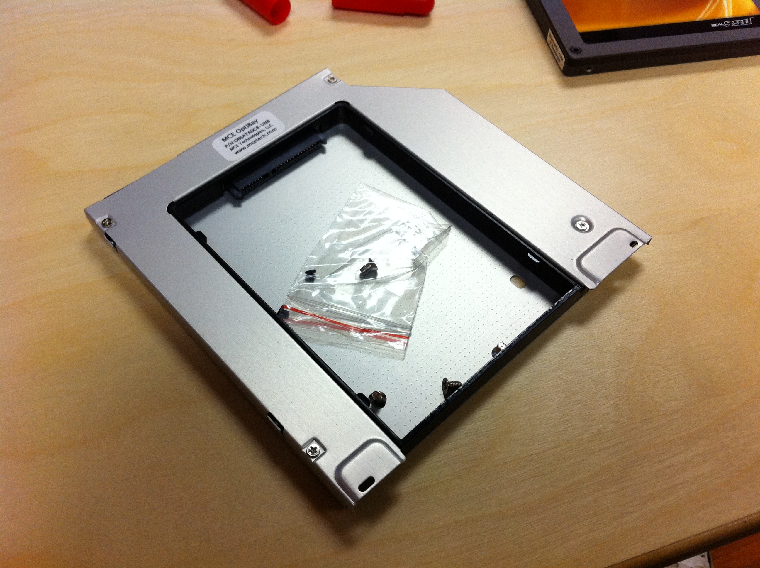On MCE, a…semi-warning? I ordered their OptiBay Extreme kit, and installed it with no problems in my early-2011 MacBook. The enclosure appeared to be well-made, and the instructions that came with it were very clear. It also appears they’ve done some R&D to justify the higher price relative to other brands, though I don’t quite have the sophistication on SATA specs to vouch for it.