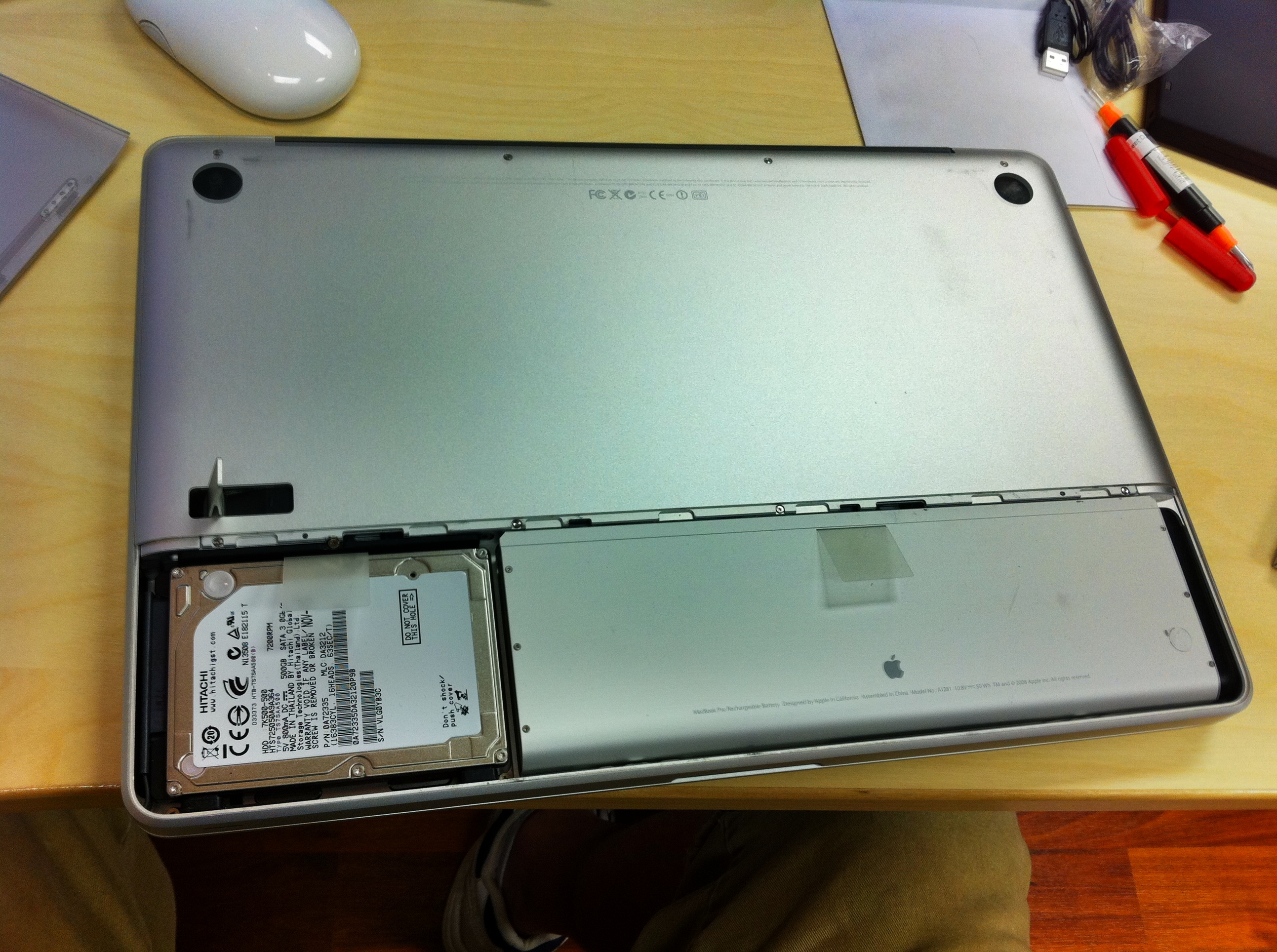 - One benefit of the late 2008 MBP, easy access to the main hard drive under the battery compartment
