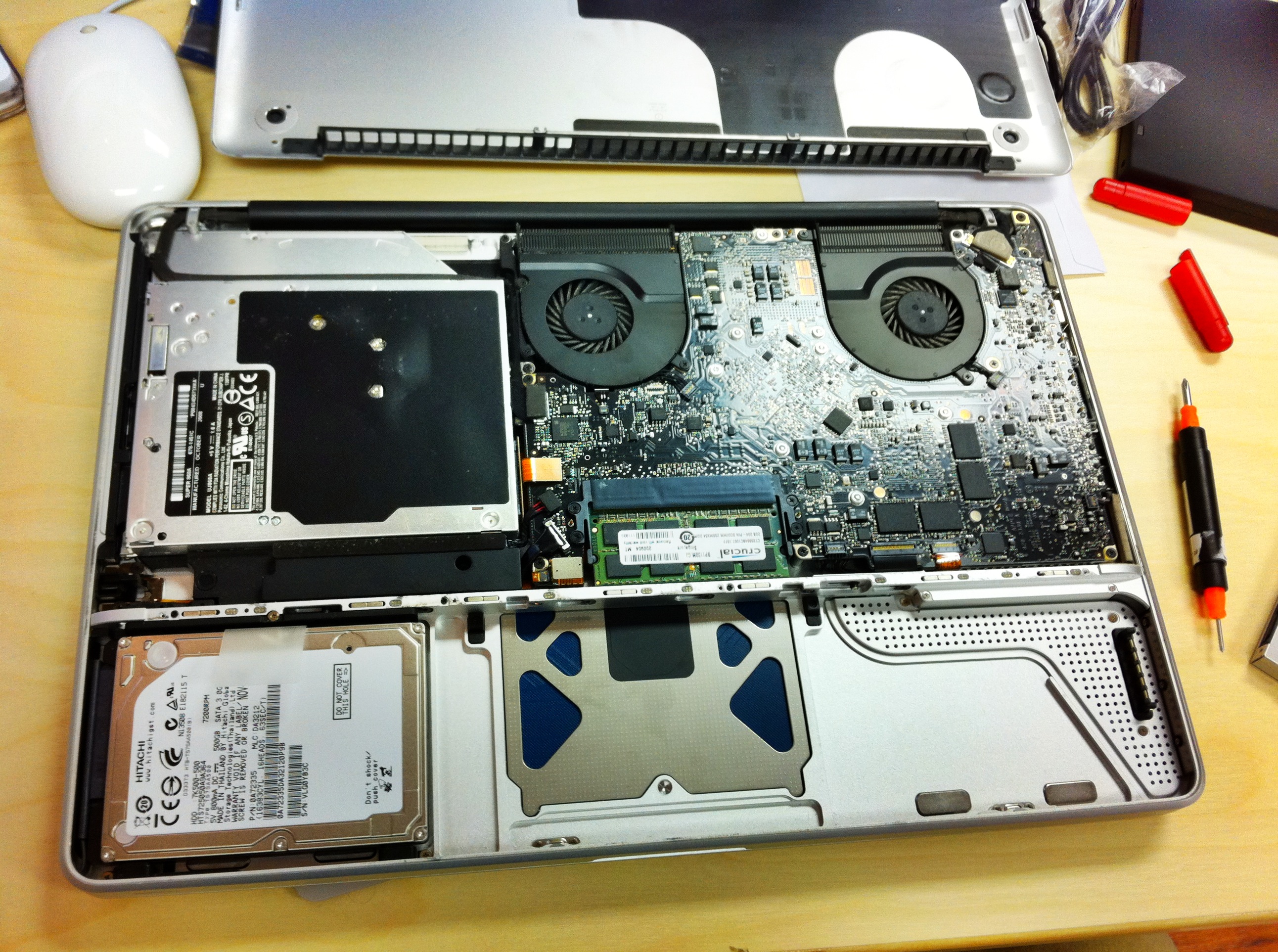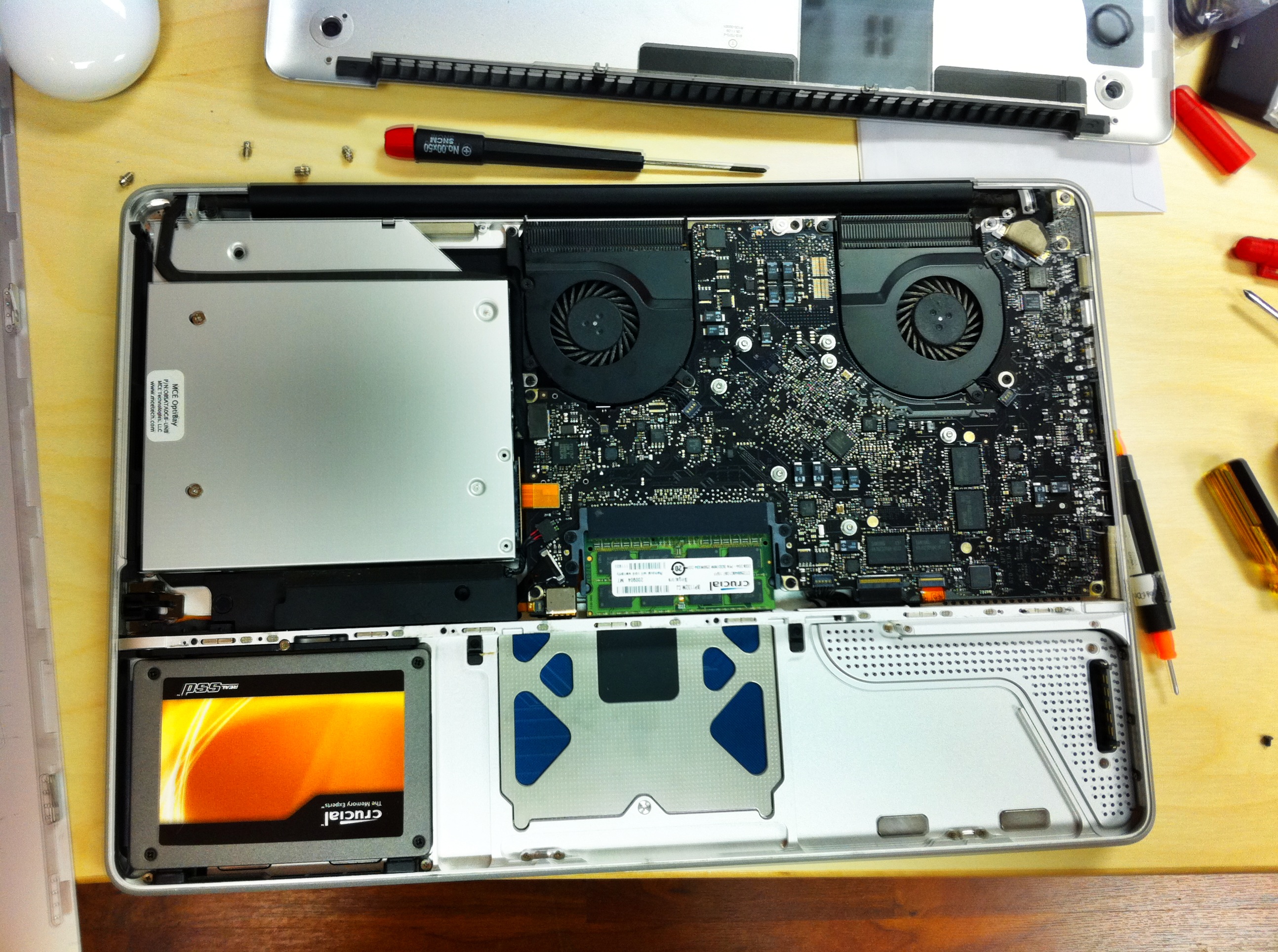 For less than half the cost of MCE’s kit, I replaced my Superdrive with the original Hitachi hard drive in a generic SATA optical bay kit, and I replaced the fans too with new OEM parts, all shipped to me from a US distributor. The generic ($10-20) SATA kits aren’t identical to MCE – they don’t have the built-in mounting bracket on the hull side – but they’re the exact same thing that ifixit is pushing for $60. The MCE kit would likely be a bit more secure, but the generic doesn’t move one bit. Don’t buy from ifixit.