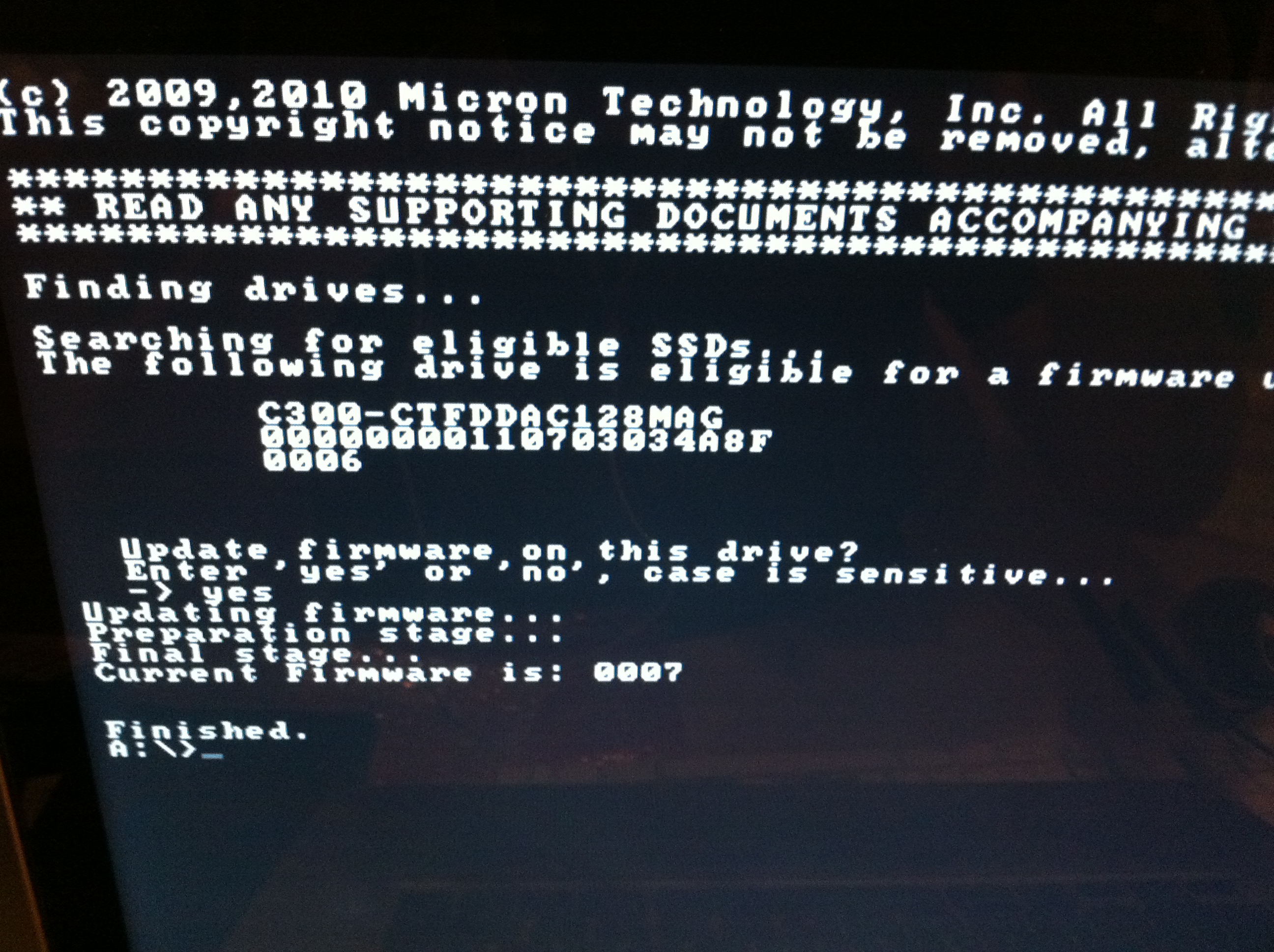 The final piece of the puzzle is something as a Mac user I’m not all that used to, and that’s manually checking for and installing firmware updates for the hard drive. In Googling, I found people mention they found huge speed increases with the latest firmware on heir SSD (although they were talking about the jump from version 001 to 006 or something). My SSD is the Crucial C300-CTFDDAC128MAG, and it ships with a firmware version of 006 (or at least mine did). You can find the firmware number in the “Revision” field in the System Profiler where you found the TRIM support earlier). Crucial’s site had a download link for version 007 of the firmware, and I decided if I was going to do this, I might as well do it right. So I downloaded an .iso diskimage from their site, which they then want you to then burn a CD of and then boot to. The irony of replacing my DVD drive with an SSD drive that I now needed the DVD drive in order to update was wonderful. Luckily, this gave me a chance to try out my “new” external DVD burner, and it worked great. If you aren’t familiar with burning disk images, basically, just fire up Disk Utility on your Mac, and you should see the .iso file on the left in your list of sources. Select it, insert a blank CD, and then hit BURN. Then, just restart your computer while holding down the C key. I eventually got this screen, and typed “yes”.