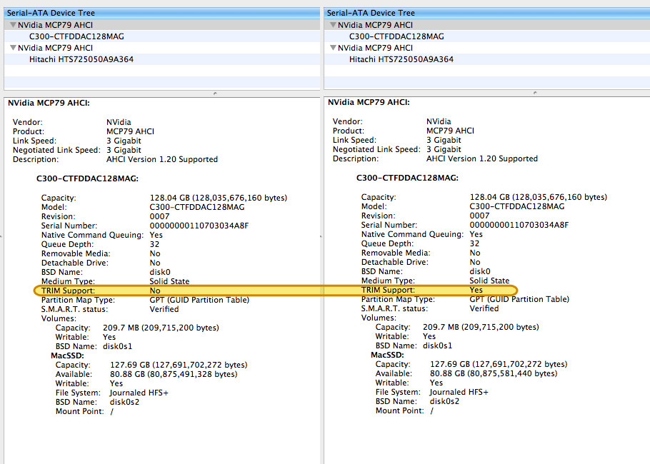 Now, in theory you are done, and can begin enjoying your drive, but there’s two more things you can, and SHOULD do now that you have an SSD drive. The first, and easiest, is to enable TRIM support. TRIM is an SSD drive’s way of keeping things tidy and running smoothly, and by default OS X doesn’t automatically support it (at least pre-Lion). If you go into your “Apple System Profiler” and click on SATA, you’ll see TRIM is set to NO. Once again, Lifehacker had my answer and the free TRIM SUPPORT ENABLER is all you need. So download that and run it.