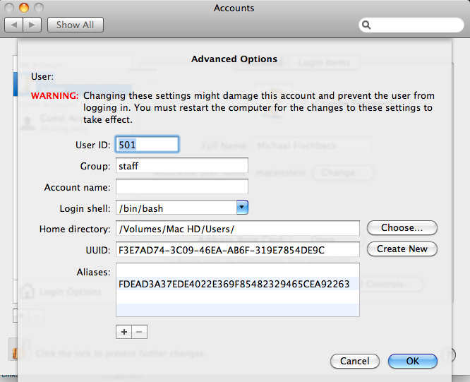 Next, click the CHOOSE button next to HOME DIRECTORY, and navigate to your old User folder on your old drive. Reboot again, and you’re done. Sort of. Pretty much everything should work fine now, aside from maybe loosing your desktop wallpaper. I found when I launched iTunes I got a permissions error, and had to actually do a Get Info on my User folder, and re-add myself as a user in order to launch it. But so far that”s the only problem I’ve had.