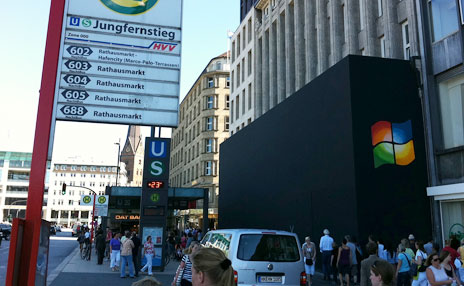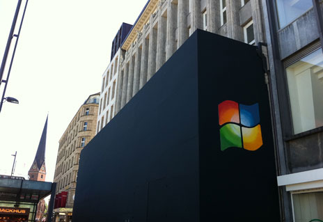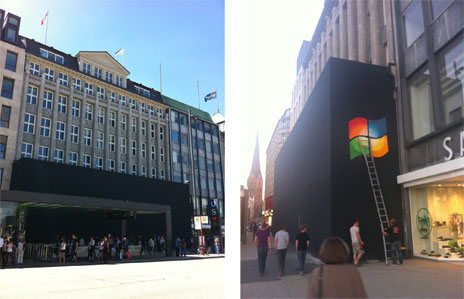 Someone painted a big Windows Logo on the Hamburg Apple Store