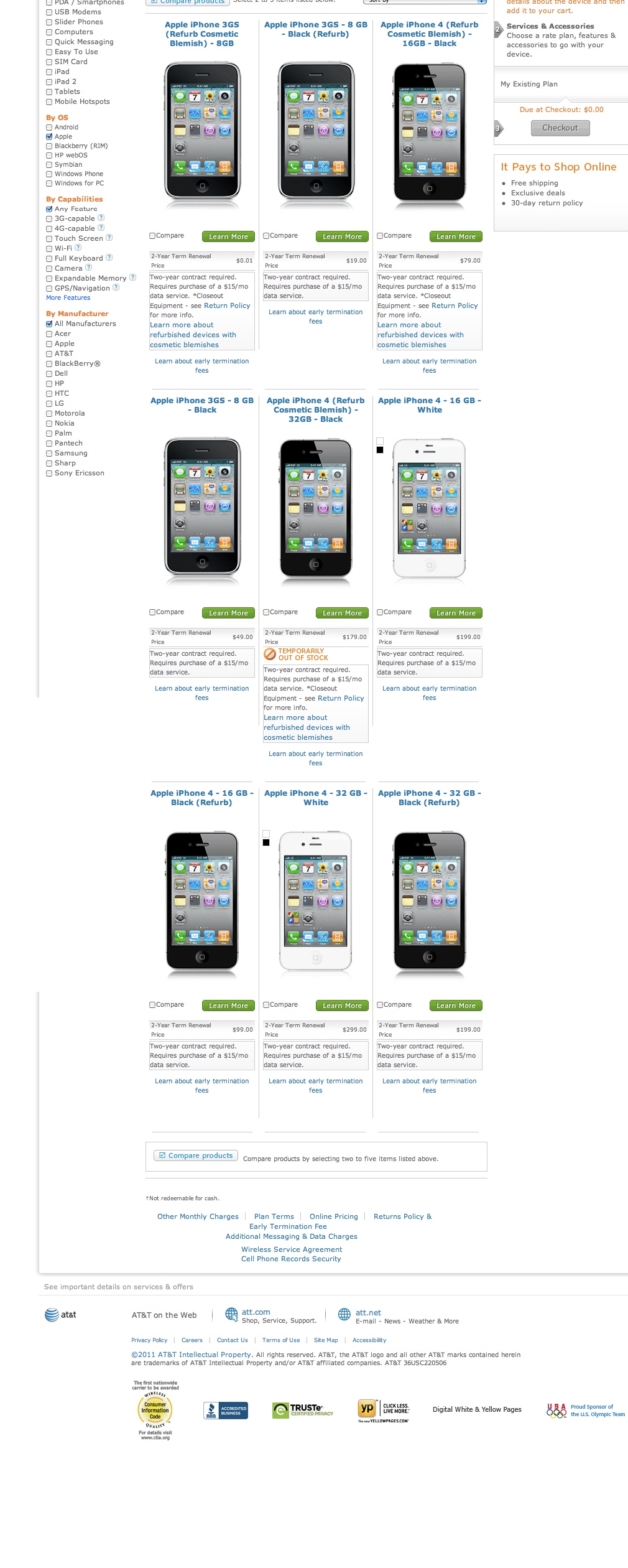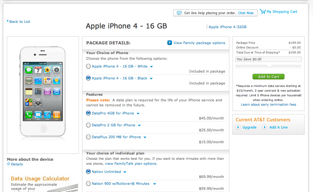 Hmmm… nothing but black refurbs for existing customers? That does seem odd. However, as much as I’d love for Apple to release some new hardware next week, my gut says we should chalk this up to AT&T not really giving a crap about giving its existing customers any decent upgrade options more than a sign that a refresh is immanent… That is, except for that it looks like new customers can only get the 16 GB white and black iPhone – no 32 GB models?