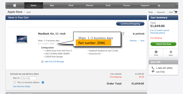 Initial benchmarks have placed the new 11-inch MacBook Air very close in performance to the top of the line MacBook Pro of last year, and shown a nearly 150% increase in Geekbench scores. Yet, for anyone doubting the awesomeness of the of the 11-inch MacBook Air, check out Apple’s part number for the fully maxed out 11-inch model.