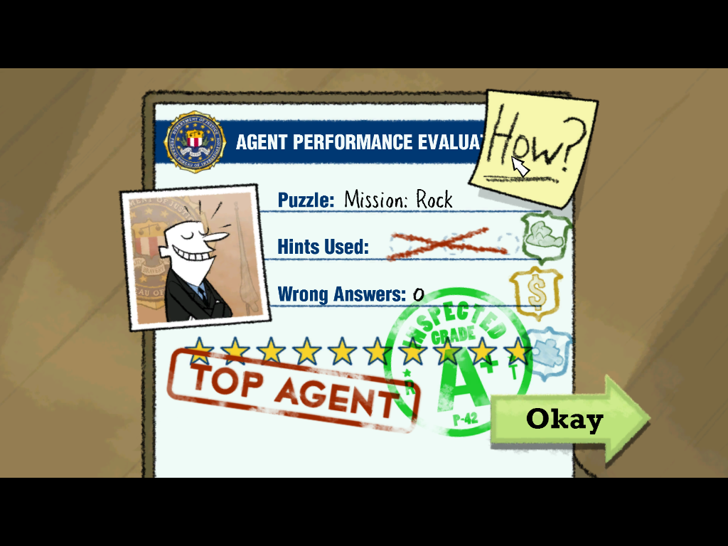 As the name implies, Puzzle Agent 2 is mainly about solving puzzles, although for the most part the puzzles themselves have little to do with the case, and merely serve as roadblocks in advancing the story. In general, the flow of the game is somewhat non-linear, and you can complete the game without solving all the puzzles (although any unsolved puzzles will be available to you at the end of the game in a sort of “free play” mode. As for the puzzles themselves, the difficulty varies wildly. I would say in general most are as difficult or slightly more difficult than the ones found in PA1, while some are quite basic and are almost filler. There were also two puzzles in particular, that I felt were just plain unfair. The first involved binary numbers, which I felt was a little outside your average person’s field of knowledge, but the second was not really a puzzle at all, it simply had you enter in 9th and 10th digits to the number Pi, and assuming you don’t know them, you have to go look them up. Also, one of the hints for that puzzles is “It’s part of a really big number”, which is not true, it’s actually part of a really LONG number. So to my mind these two puzzles required an internet connection or at least a trip to the library in order to complete, so iPod touch users away from WiFi, beware (these actually turned out to be two puzzles that were not needed to solve to complete the game, incidentally). That being said, the rest of the puzzles were solveable, enjoyable, and challenging enough that you could legitimately feel smug for completing them (that is until my 9 year old told me she already beat the game).