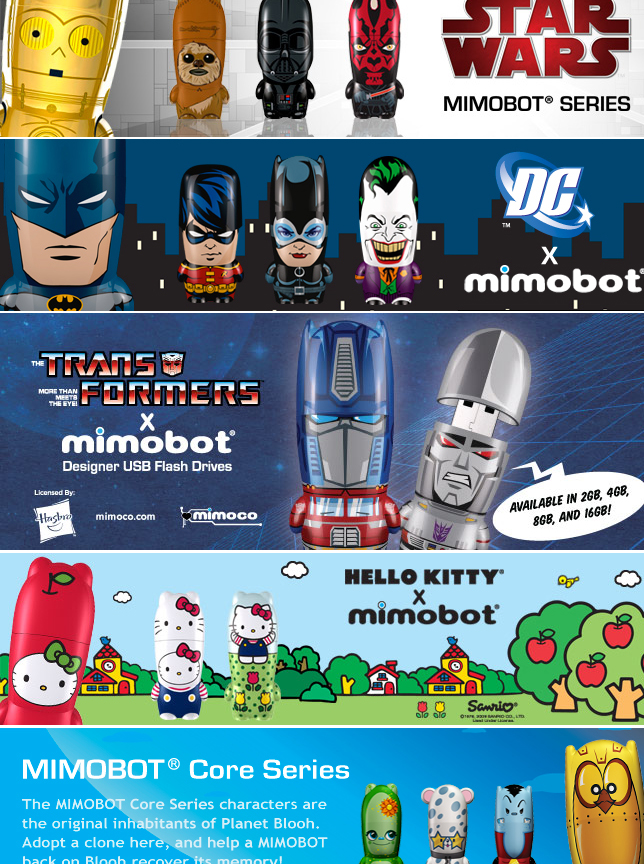 It’s that time of year again – time for the Summer Hollywood Blockbusters! And what better way to celebrate your favorite pop culture characters than to carry around an adorable USB thumb drive version of them with a removable head? Well, we’ve once again teamed up with our good friends over at Mimoco to bring you yet another sweet Mimobot giveaway, and this one’s TWICE as cool, because this time we’re giving TWO lucky winners their choice of ANY in-stock 4 GB Mimobot!
