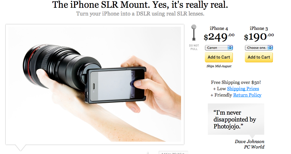 How many times have you been out with your iPhone and wished you could attach a giant SLR lens to it to capture that perfect shot? Never? Agreed. Yet apparently the folks at Photojojo think someone, somewhere is interested. Check out their iPhone SLR Mount.. For just $249 (iPhone 4 model) you can hook up your Canon or Nikon SLR lenses to your iPhone and… oh God, are they sure this is real?