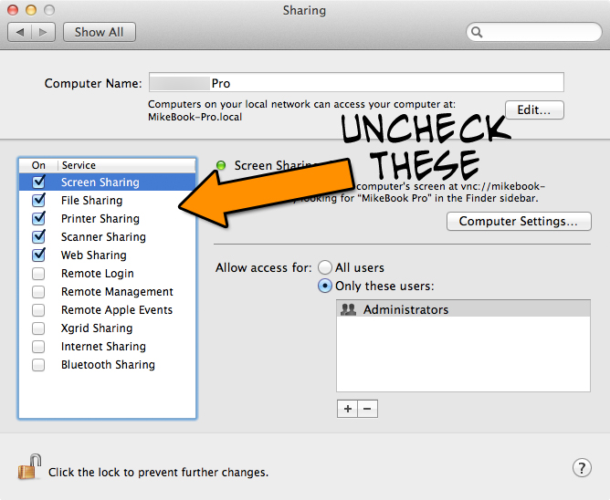 🙁 I’m pretty disappointed. This didn’t work for me, because when I got to the Sharing screen in System Preferences, …..everything was ALREADY unchecked. What can I do?