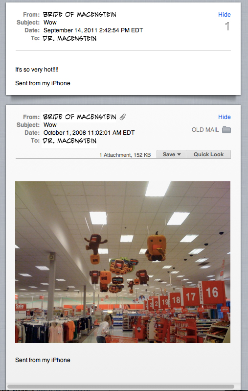 What you are seeing is her sending me an e-mail with the subject “Wow”, then letting me know that it is hot outside. This is of course vital information for someone such as myself who works in an underground bunker, devoid of any hint of a window. But then also notice that Mail has decided that her message is a continuation of a conversation she started back in 2008 when she sent me a picture of Target’s Halloween displays, featuring Halloween-themed Domo dolls hanging from the ceiling (ALSO another very important e-mail) with the same subject.