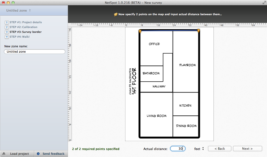 Once you have your blueprint you can import it into NetSpot and enter the total length and width of the plans, and it will calculate the rest of the measurements for you. Then basically all you need to do is walk around each room in your home with a WiFi enabled MacBook running NetSpot, and keep clicking to add measurement points, and the more the better. NetSpot quickly measures signal strength and various other aspects at each point, and when you’re done, you can stop the scan to view your results.
