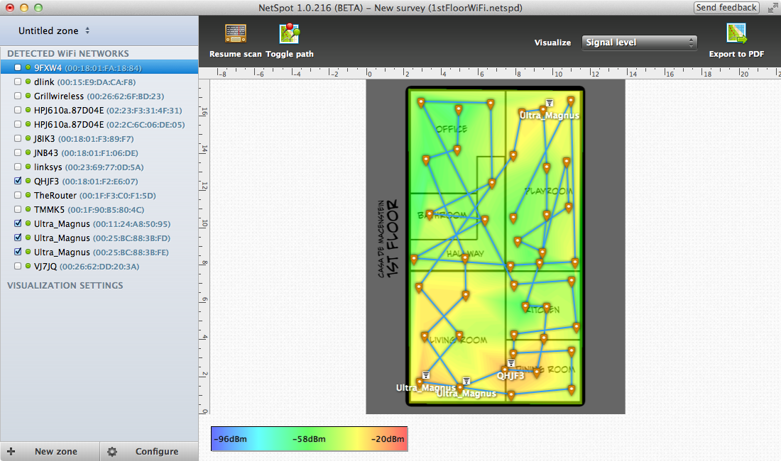 A handy drop down let’s you choose whether you want to view signal strength, signal to noise, Qty of Access points, etc. Odds are if you live is a residential neighborhood such as mine, NetSpot will find about 15 or so OTHER WiFi networks you don’t care about, so you should uncheck these int he sidebar to give you a better idea of how your network in particular is doing.