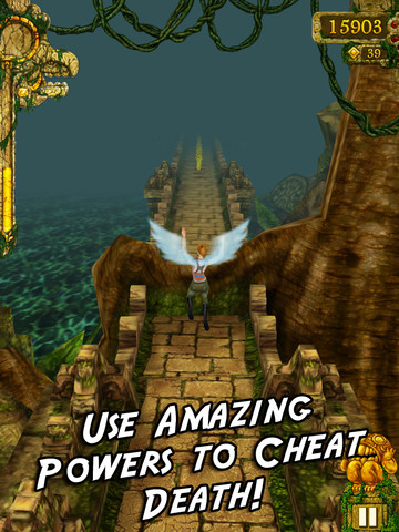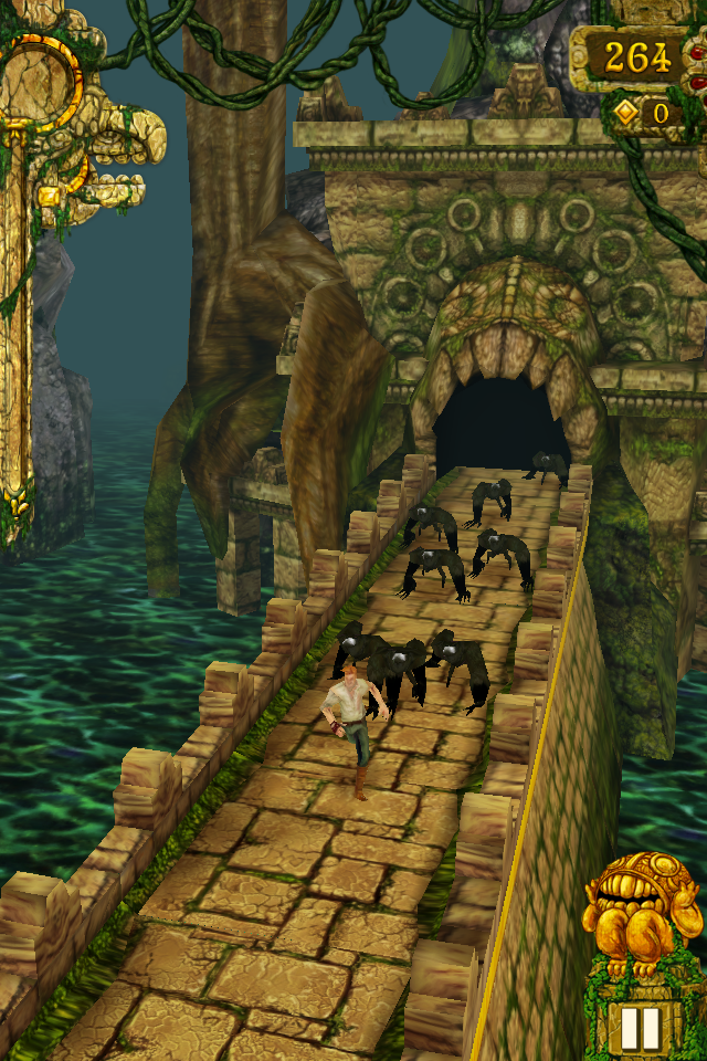 Today’s game that doesn’t suck is Temple Run (iTunes: free – Universal) , from Imangi Studios. This is a quick-finger, endless running game sort of like former “GTDS” Gravity Guy, or The Impossible Game, but with a great 3D twist and Indiana Jones adventurer theme to it that makes it even more enjoyable.