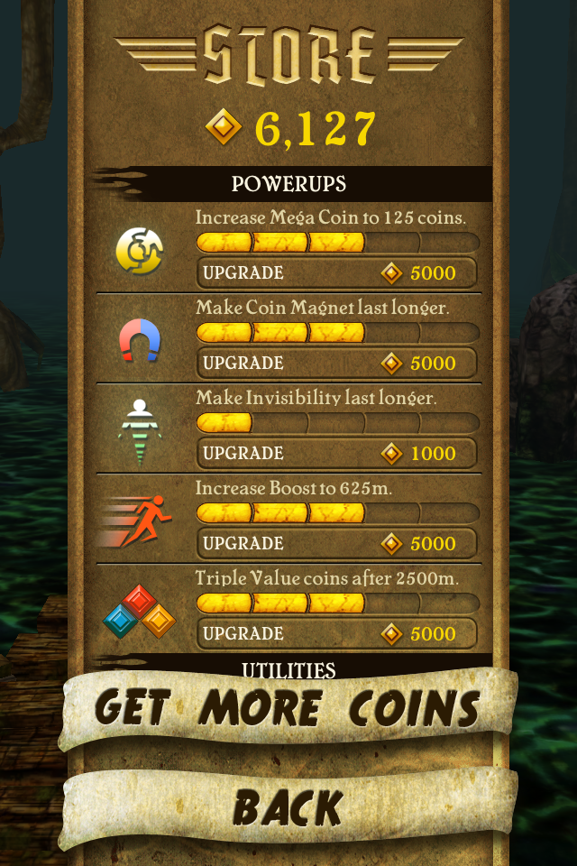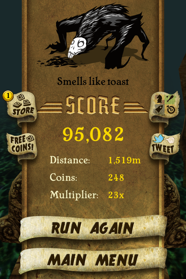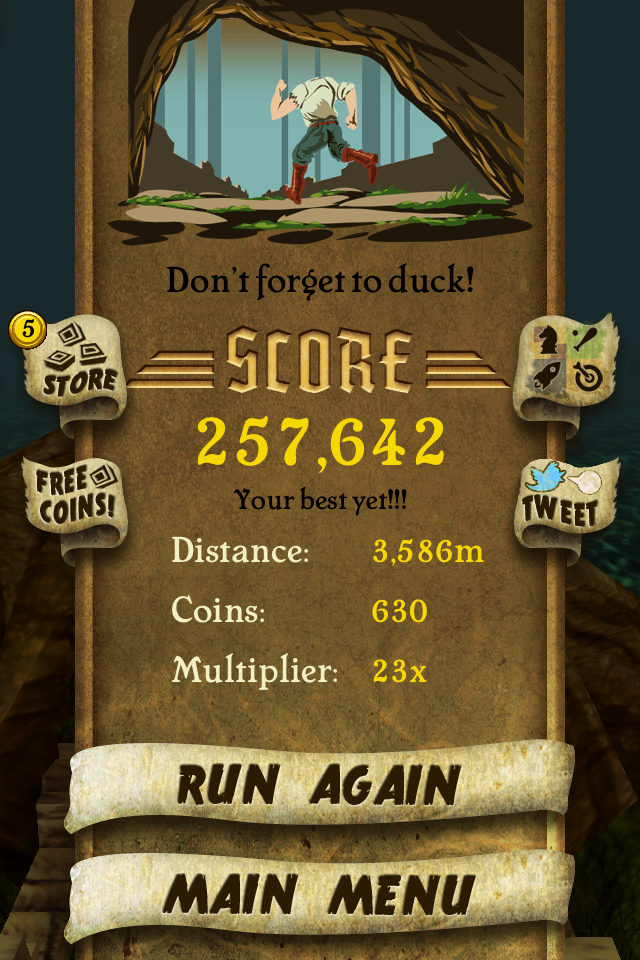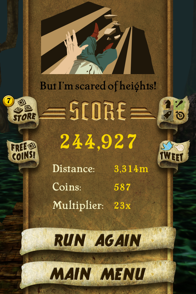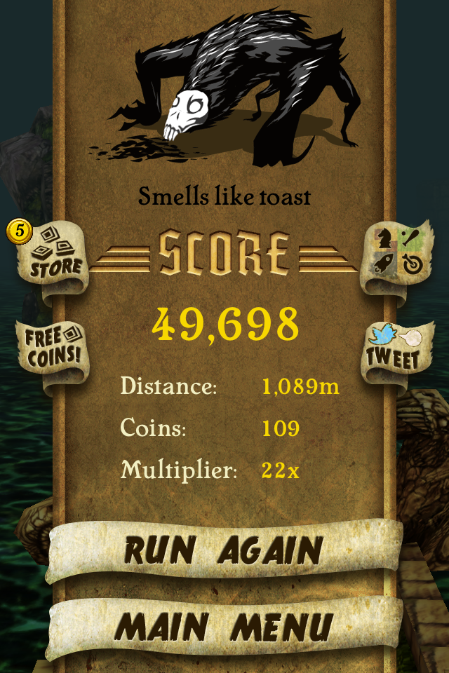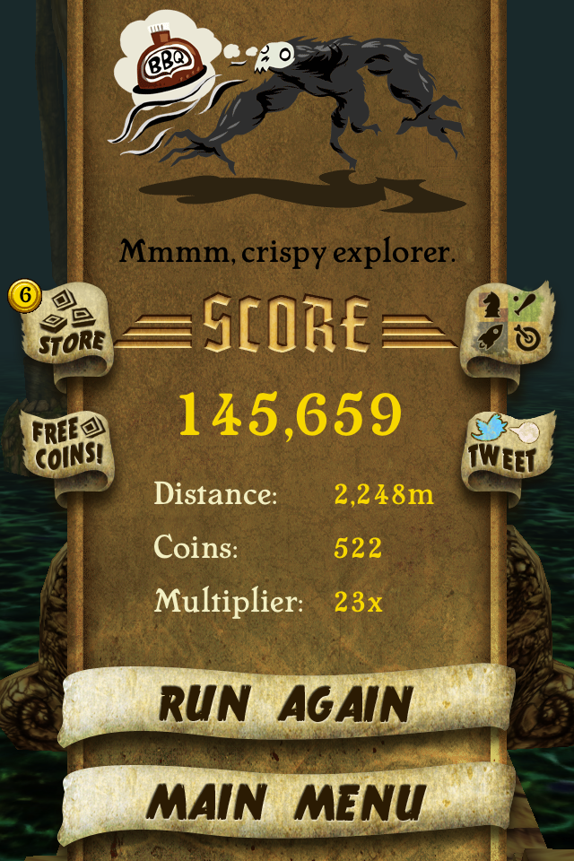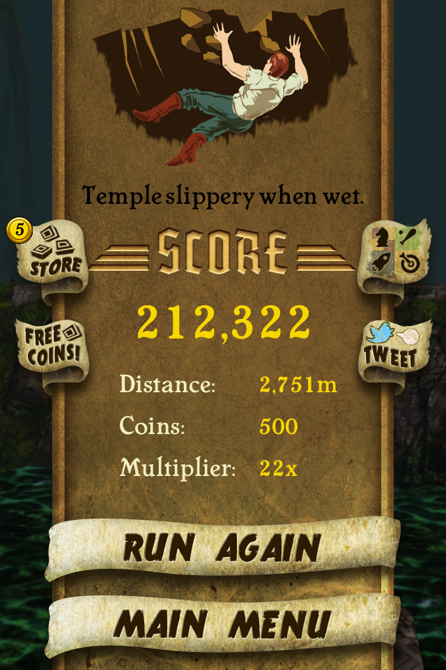 During a quick tutorial you will learn the basic controls which consist of 1 finger swipes (left, right, up (jump), and down (slide)) which you use to avoid obstacles and keep from falling to your death, all the while being chased by skull-headed-demon-monkeys. As you run through the randomly generated world, you will inexplicably see floating coins you can collect by tilting your device. These coins serve as currency that you can use in the Temple Run store to purchase and upgrade various powerups which will help you stay alive longer. You can buy extra coins with real money if you’re impatient, but the game is so addicting I’ve found you can collect coins on your own simply through playing. The game does tend to move fast, and can at first seem frustrating, but after about 5 minutes you will find your rhythm and get a real feel for the timing of your swipes and begin trying to beat your best time. I also enjoy the tense, driving soundtrack which is primarily made up of jungle drums which at times sound almost exactly like the beginning of Van Halen’s “Hot for Teacher”.