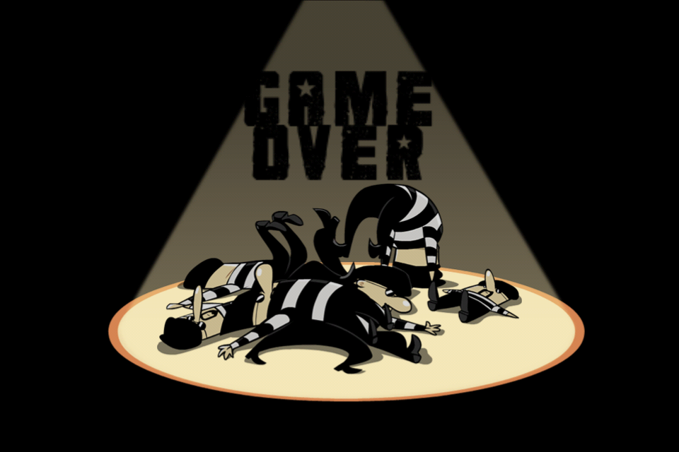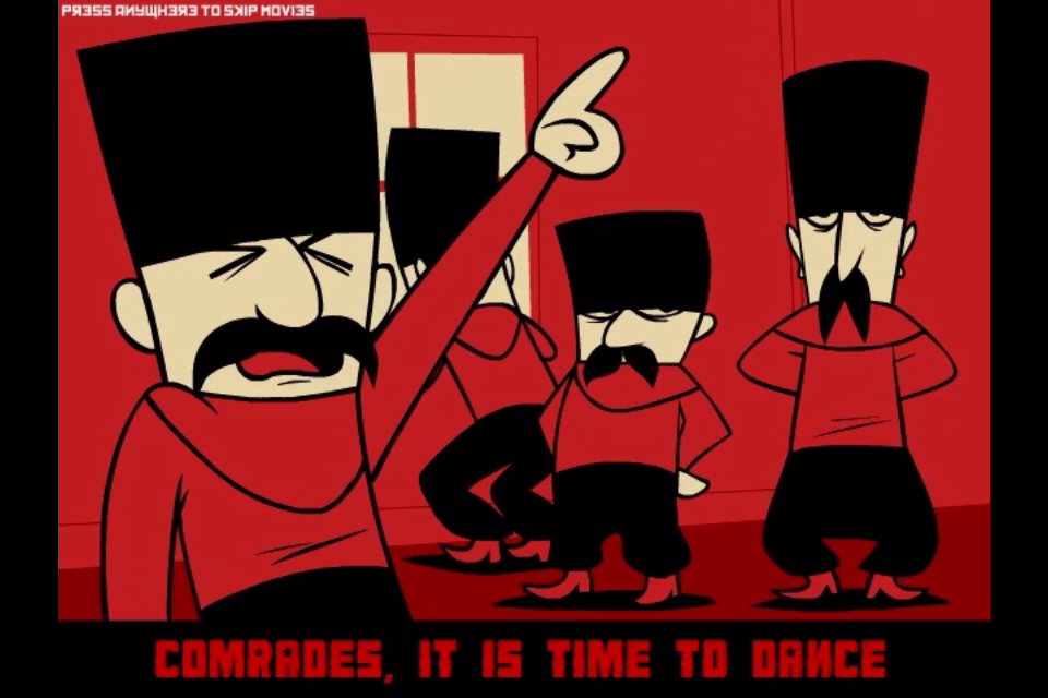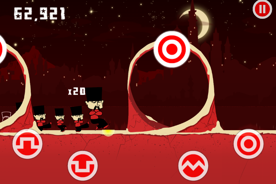 Today’s game that doesn’t suck is the amazingly awesome (and hilariously bizarre) Russian Dancing Men (iTunes: 99¢ – Universal) , from SmashMouth Games. At its heart it’s basically a rhythm game where you need to tap one (or two) buttons at the appropriate time to help your character (a Russian Dance troupe leader) get his group safely over the various obstacles that a certain zombie leader left for them. But where I could never really give two shits about the Guitar Hero type rhythm games where you tap a couple colored dots as they slide at you, I found myself thoroughly addicted to this game this entire weekend thanks to its wonderfully random sense of humor.