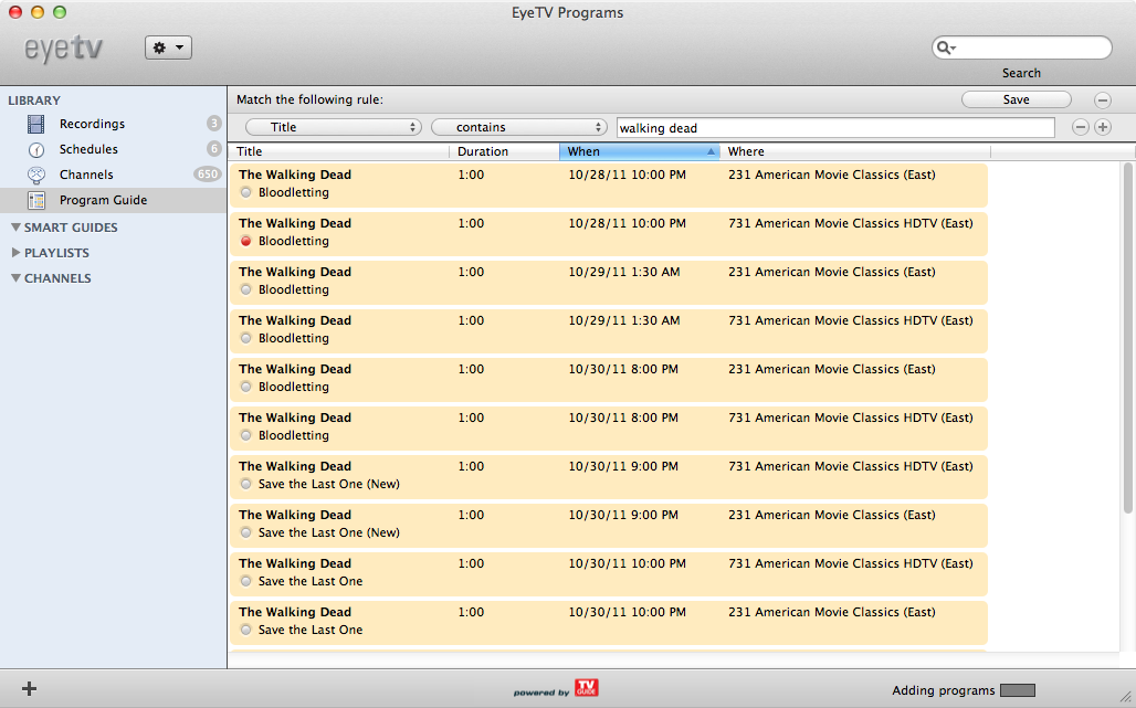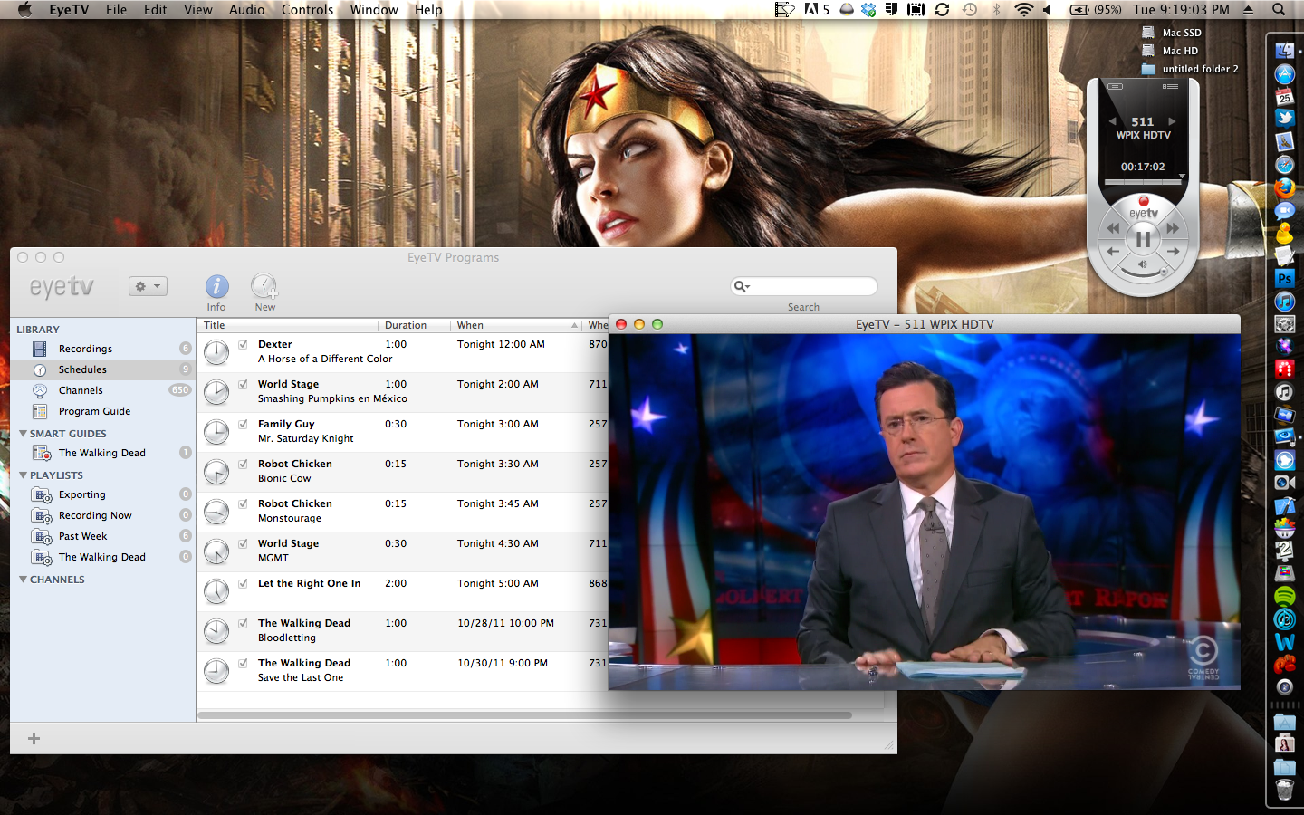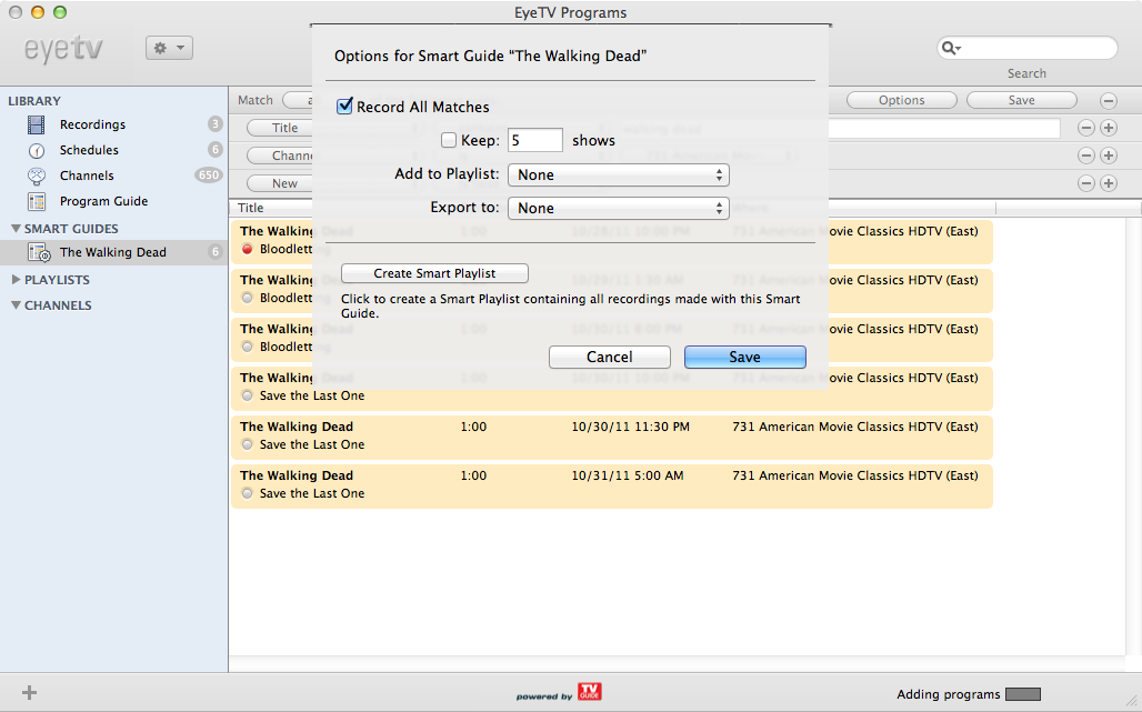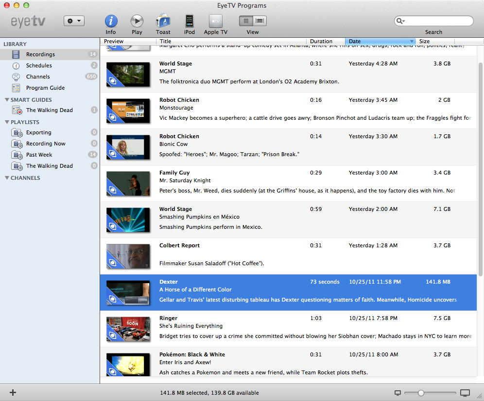 You can also set up recordings to automatically export to either an iPod, iPhone, iPad, or Apple TV compatible format when they complete, and even automatically add themselves to your iTunes library. The nice thing is that EyeTV will auto-populate all the relevant fields for you in iTunes based on the TV Guide description such as show title, name, and the full description of the show as it appears in the TV Guide listing. Assuming the Mac doing the recordings is the one you sync your iDevices with, that means each morning you can have a brand new episode of the Colbert Report or the Walking dead on your iPhone when you wake up, ready to make that morning commute a lot more enjoyable (assuming you take mass transit, and aren’t driving).