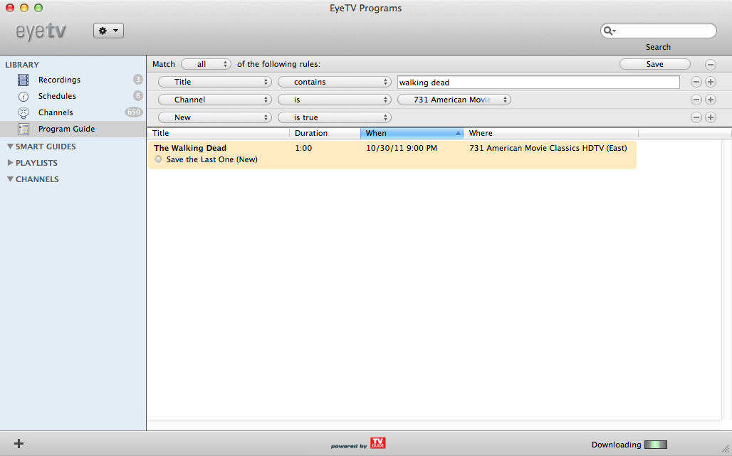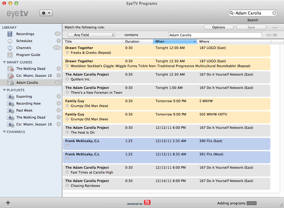 OK, so assuming you have a compatible Mac within throwing distance of your TV and are using some sort of cable or satellite TV service, there are two ways you can use your EyeTV. The first way is to use the included EyeTV 3 software to record programs. If you have ever used a Tivo or similar DVR, the process should be very straightforward, and the EyeTV software is very well-designed. Recordings can be scheduled simply by clicking on events in a program guide (powered by TV Guide via a free 1-year subscription) which auto-updates each day. Listings are custom tailored to your TV service and Zip Code, so for example I have Verizon FiOS, and it quickly downloaded the specific channel lineup for my local service. Once a program is selected you can decide whether to record only that show, the entire series, or only new episodes, etc. This is handled through setting up a “Smart Guide” which works very much like setting up a smart playlist in iTunes, where you can describe all the criteria that needs to be met in order to record a show. For example, you could set up a recording that only records CSI: Miami, on channel 502 (my HD CBS Channel) that are NEW. You can also create a Smart Guide for a specific person. For example, here’s what will record if I do a search for Adam Carolla.