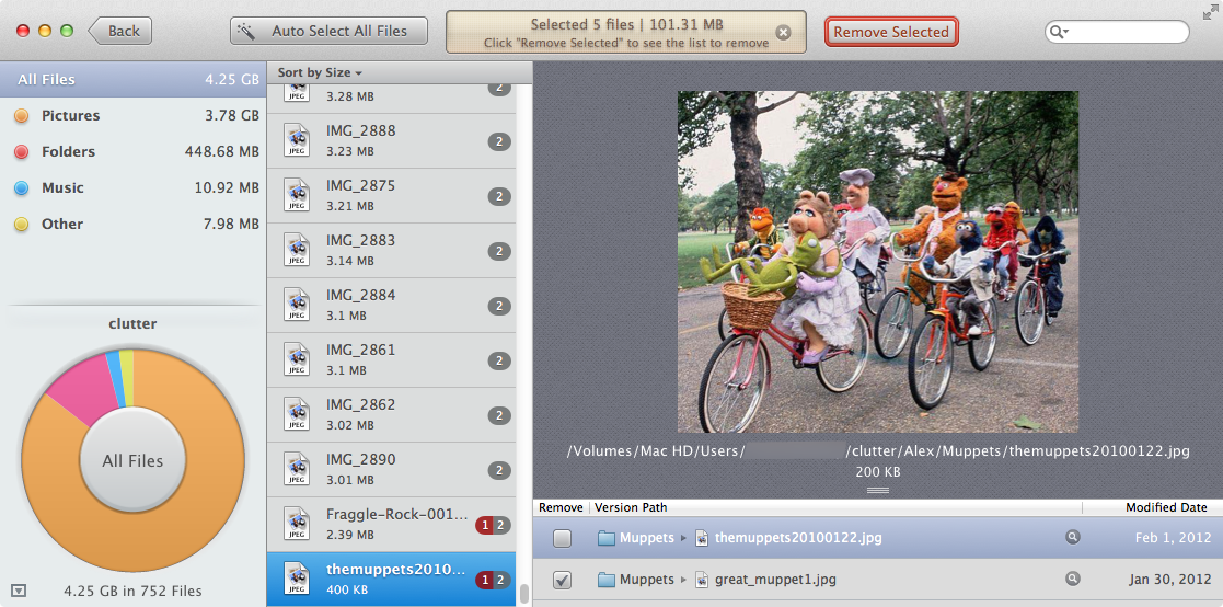 Anyway, the interface is quite slick. When you have finished your scan, Gemini will display a list of the potentially duplicate files and folders it found, and clicking one will show you the file path of each copy of the file. You can then manually click a checkbox and hit the red REMOVE SELECTED button at the top of the interface. This will add that version of the file to the removal queue (it does NOT yet delete the file) and you can continue to go through the list, adding files as you see fit. Once you’ve completed choosing all the files you’d like to remove, you can then hit the REMOVE button and you will be treated to a little animation of your files being “shredded”. And really, even at this point your files are still OK. Shredding simply moves the duplicates tot he Trash. If you REALLY wanted to, you could find a mis-shredded file and restore it.