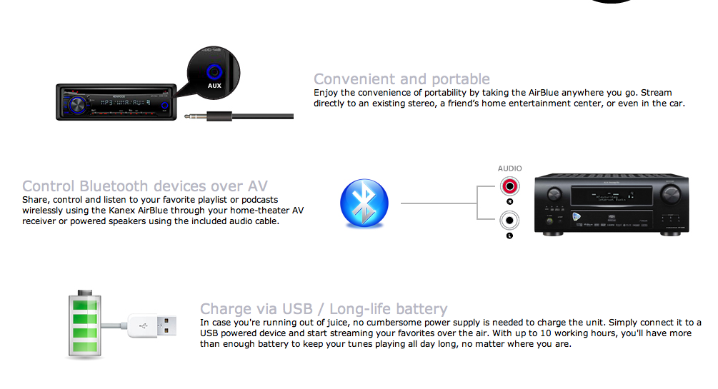 The Kanex AirBlue™ is a portable Bluetooth-based music receiver that enables you to wirelessly play, listen and control all your favorite media from your iPod touch, iPhone or MP3 player through your home stereo or speakers. Even your car! In fact you can stream music from pretty much any bluetooth audio source to anything that has an Aux port.