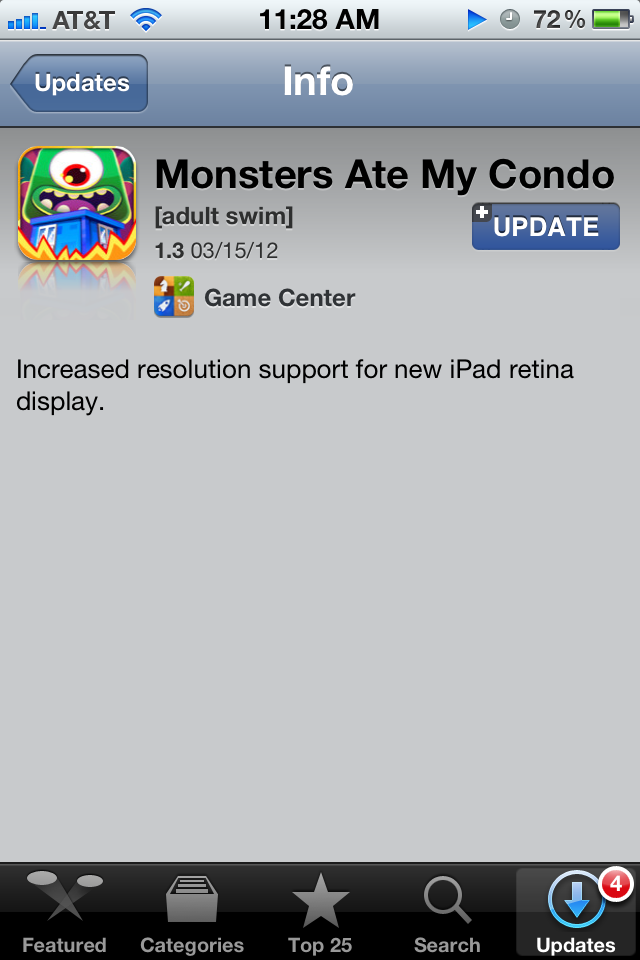 Now, starting late last week, I began receiving an increase is my (universal) App updates, where the only listed feature is “support for the new iPad display”. Here is a good example: