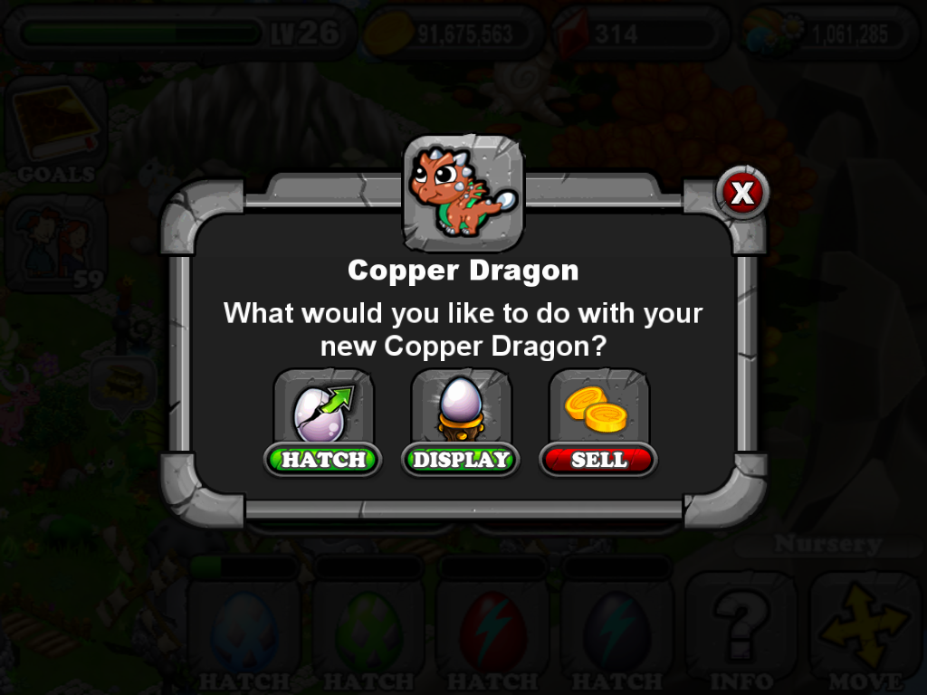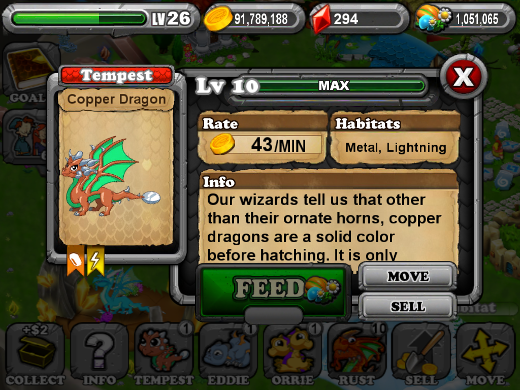 I was trying to breed a plasma or current (either would be nice!) using lightning and rust. Was confronted with a 20 hour hatching time. Didn’t even know the copper dragon existed until I checked out the eggs list in the market to find out what I was breeding. Don’t think I’ve ever got a new dragon that easily before!