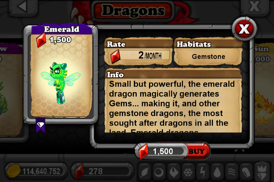 This was a tough one to get. I often can get a gemstone dragon within 3-4 days of trying – not so with the Emerald. It took me over two weeks, but I finally got it. I had to feed my Crystal and Lichen up to Level 17. That’s the highest I ever had to level a pair up to breed a certain dragon. Can’t wait to hatch it. 🙂