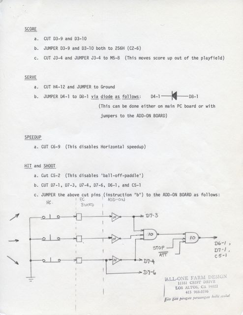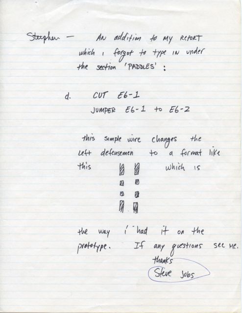 This memo describes changes that could be made to Atari’s World Cup Soccer arcade game. These changes were designed to add play variety to the game and to extend the ‘shelf life’ for arcade operators. While the memo is typed on Atari letterhead, it also features a stamp imprinted with the name of Steve Job’s company at the time “All-One Farm Design” and the address of the Jobs family garage( and the birthplace of Apple Computer). The memo features a circuit diagram and a hand written addendum.