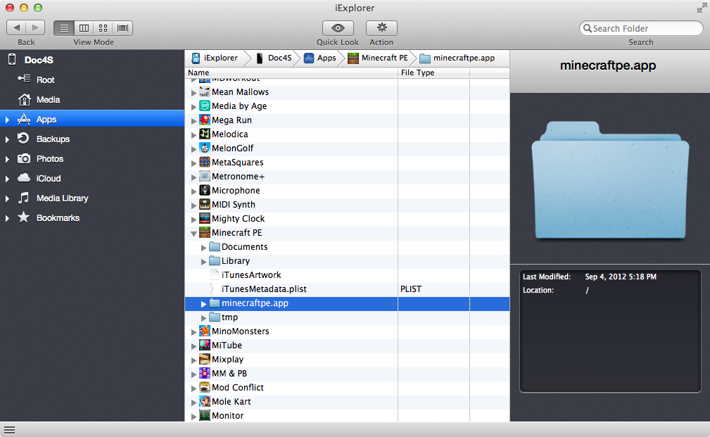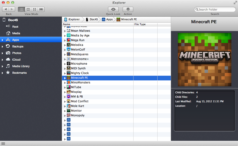 Step 04: In the left-hand column of iExplorer, you should see a list of items on your iPhone. Choose APPS, and then scroll down to find Minecraft PE.