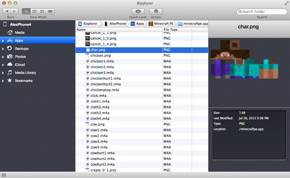 Step 10: Drag it back into the “minecraftpe.app” folder in iExplorer. This almost always works on the first try for me, but I have had occasions where the file did not look like it copied over, but it did indeed. So if it doesn’t show up, don’t panic. Try launching Minecraft, and see if your skin worked. If not, quit it (and force quit it from the iPhone tray), and just keep dragging in your new char.png file until it does.