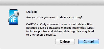 Step 08: OK, so now comes the only sort of scary part. What you want to do now is go back into iExplorer, select the “char.png” file, and hit COMMAND DELETE (or right click on it and choose “Delete”). You will be prompted that it’s a bad idea to delete files if you don’t know what you are doing.