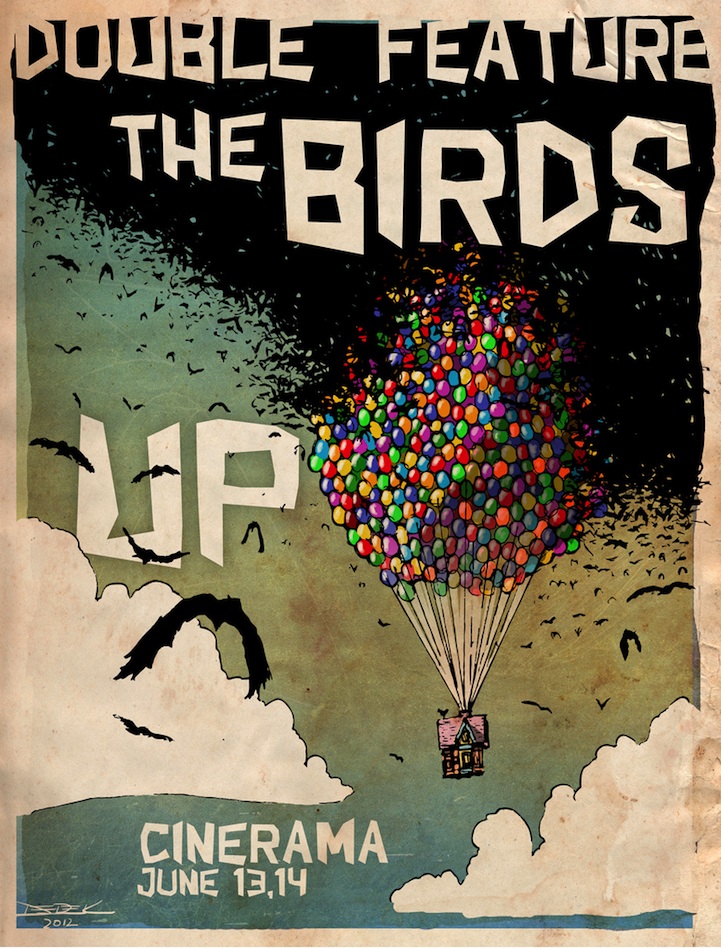 Usually when one hears the term “Mashup”, they think of a horrible pop song shoe-horning itself into a classic, well known song to generate quick sales for a talentless new “artist”. Or is that just me? Anyway, MY favorite mashups are the ones some VISUAL artists do for fictional combinations from the film, tv, and comic worlds. Case in point, this awesome “Up”/”Birds” double feature poster by Derek Chatwood, which is available as a print here if you like to send me one.