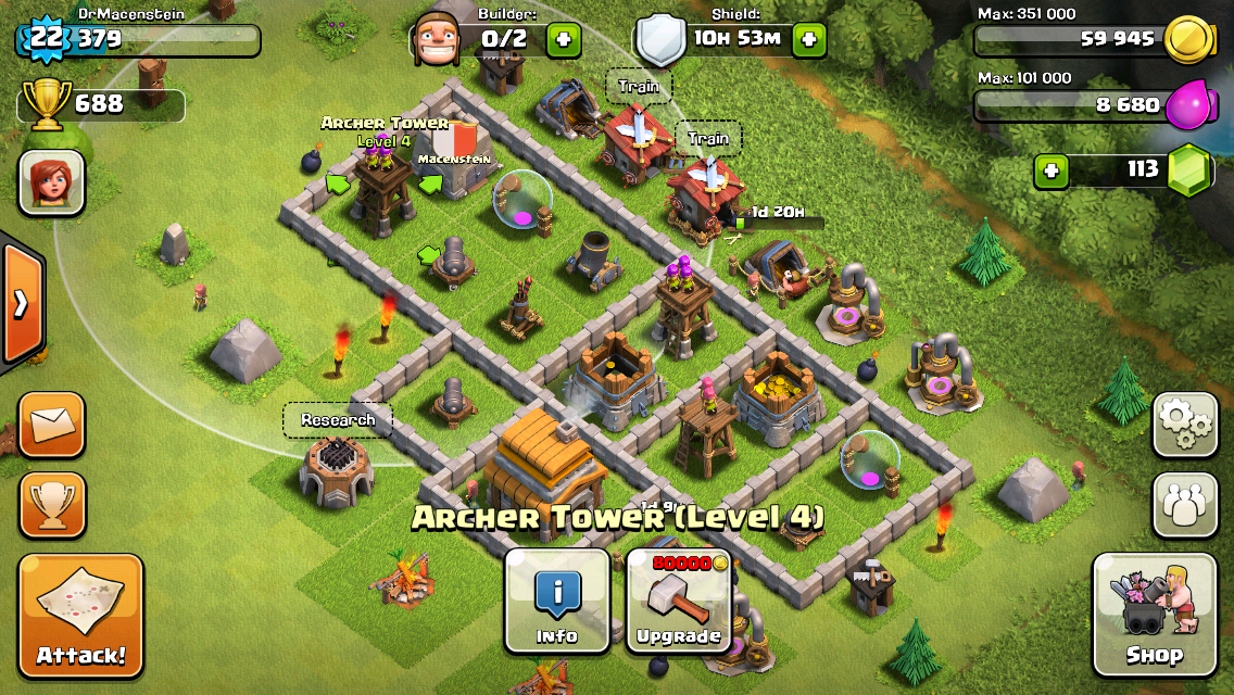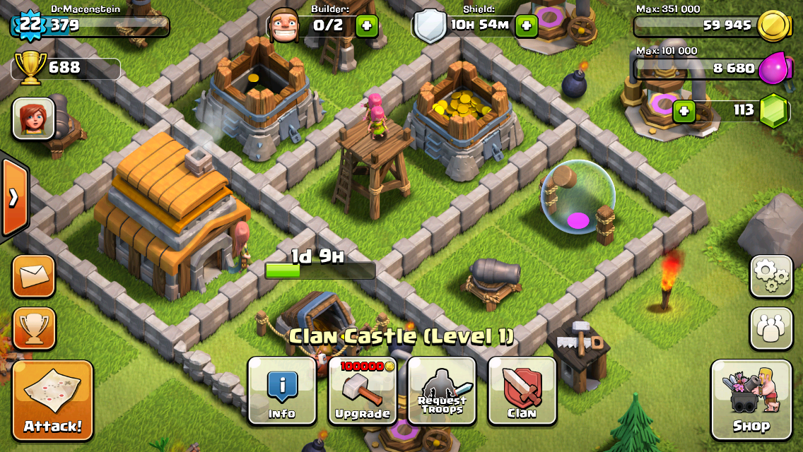 I have to say while this game is cool in the beginning it sucks after level 60. You can’t save up resources since the business model is after 1.5 mil gold you have to use gems since players will steal it faster than you can make it. So So my minimum upgrade is 3 mil at a cost of 5 bucks an upgrade.