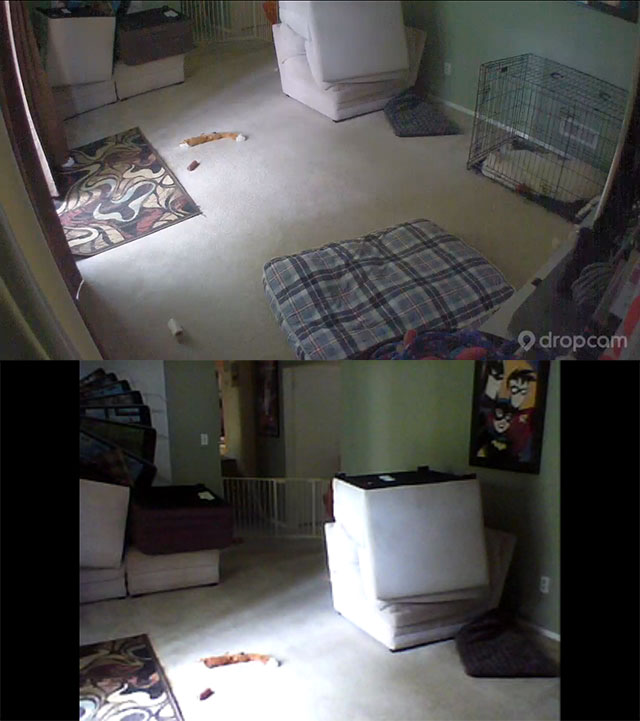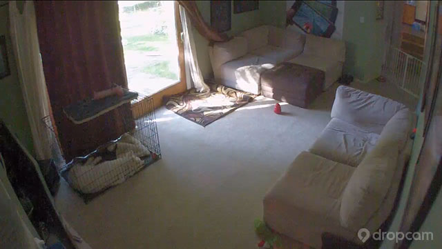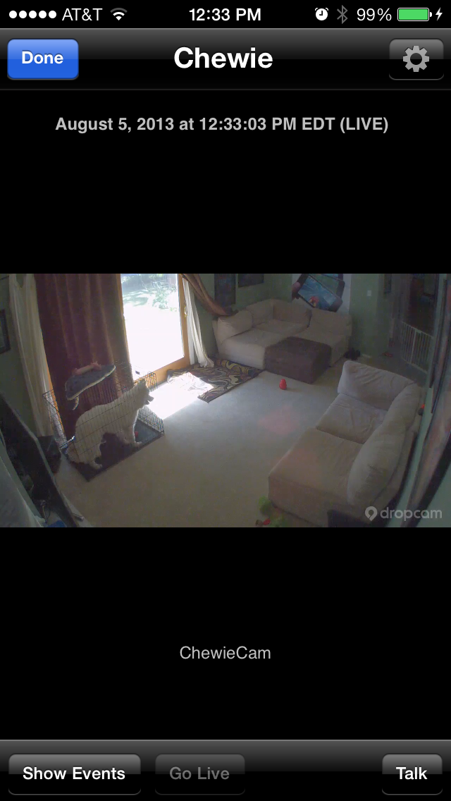 My only major complaint with the DropCam is a missing (and invaluable) feature I had on a competing brand’s camera – namely, the ability to draw out a region on the camera’s screen that you wished to have it detect motion in. Currently, you have the ability to detect ALL motion in a room, or NONE. But those of us who use the DropCam to monitor a pet in a crate or a baby in a crib might wish to exclude those regions from the motion sensor, and just let us know if anyone entered the room in general. Or imagine you have a fish tank with moving fish, or a ceiling fan in the shot, or an area of a wall that you found kept getting blasts of sunlight every time a car drove by outside between 2:30 and 3:15 on a sunny day. I found the ability to draw a box around the area I wanted monitored to be very useful, and because the DropCam does not have that ability, I can’t really use it as my one and only security camera if I want to receive motion alerts. For example, suppose I want to know when my dog-walker comes over to take Chewie out. I can’t really do that on the DropCam unless I want to also be notified every time Chewie rolls over in his sleep. It is a very useful feature, and one I’d love to see DropCam implement so I could “drop” my other cams. (See what I did there?).