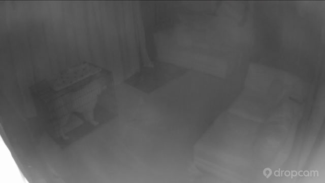 Another nice feature of the DropCam is its Night Vision mode. The DropCam can be set to “auto-Night Vision mode”, which will switch back and forth depending on available lighting conditions, or you can leave it set to always on or off (these settings can be quickly changed via the iPhone app). I noticed a faint clicking sound when the camera switches modes, so at times such as dusk when your camera may be struggling to find a happy lighting choice, it could be annoying, or worse, wake a sleeping pet or baby you desperately want to stay quiet, so in those cases I would suggest choosing Night mode manually before going out. Video-quality-wise, Night-Vision mode is handled well, giving you a very creepy, Paranormal Activity-esque black and white image of your room that is pretty discernible, although somewhat lacking in contrast. But assuming you are familiar with the room you are looking at, you should have little trouble picking out detail. The Night Vision works via a series of infrared lights placed around the lens, which are visible in a dark room, so if you are thinking of using the DropCam to secretly record in low-light conditions without someone noticing, you’re out of luck. However you CAN disable the bright “status” light which makes hiding a nanny cam a little easier and makes the DropCam less obvious. It is important if you plan to use the night-vision mode you place the DropCam where it will not reflect back of lot of the infrared light on anything white. I first placed the camera on a white bookshelf, with a small corner of the shelf in view, which was fine during daytime viewing but blew out the night-time video a bit.