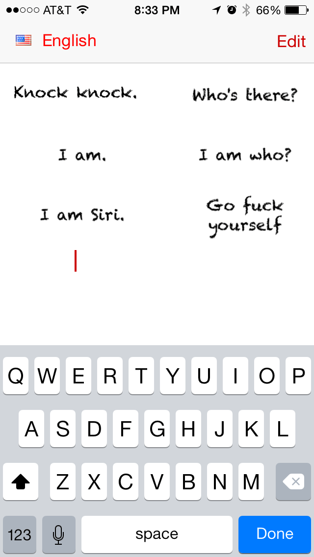 What’s neat about this app is you can type in a bunch of phrases before hand, and then “Siri” will speak them when you tap on them. So for instance, you could set it up by asking Siri, “Hey Siri, who’s the hottest guy in the room?” and then just tap the reply “Dr. Macenstein is ALWAYS the hottest guy in the room.” It’s probably what Samsung uses to make all those “hilarious” commercials where Siri sounds all depressed.